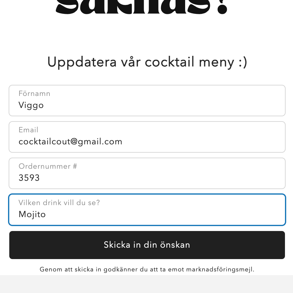 Formuläret ovanför kräver ett ordernummer som du fått i din mail så fort du köpt en vara, samt din mailadress och såklart DIN DRINK!
